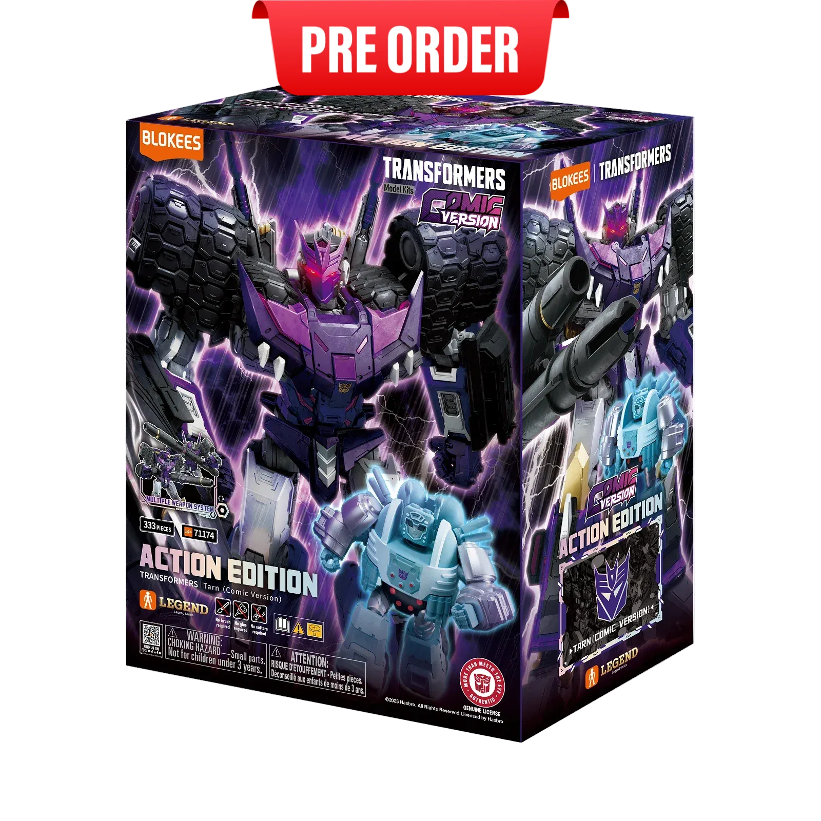 Unleash the power of Tarn, the fearsome DJD leader, with this Tarn Comic Version collectible. Composed of 333 pieces and featuring 64 points of articulation, it allows for dynamic and intense poses. The magnetic control breathing light effect adds to his intimidating presence, while interchangeable faceplates and battle-damaged accessories enhance the realism. A must-have for any Transformers fan seeking to showcase this iconic Decepticon warrior.